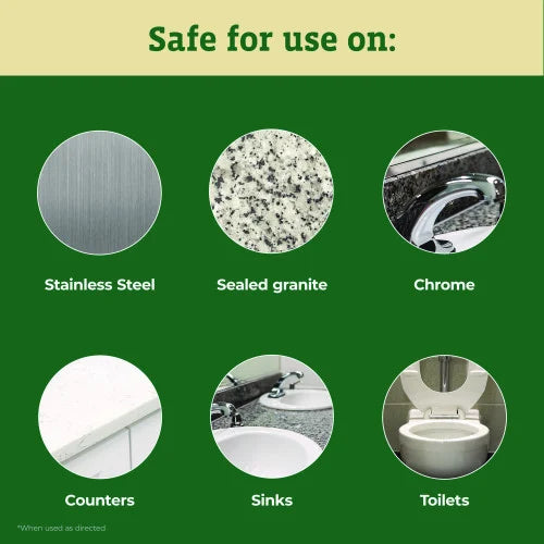 - Safe on multiple surfaces throughout the kitchen and bathroom, including counters, appliances, stainless steel, sealed granite, chrome, cooktop hoods, sinks and toilets.
